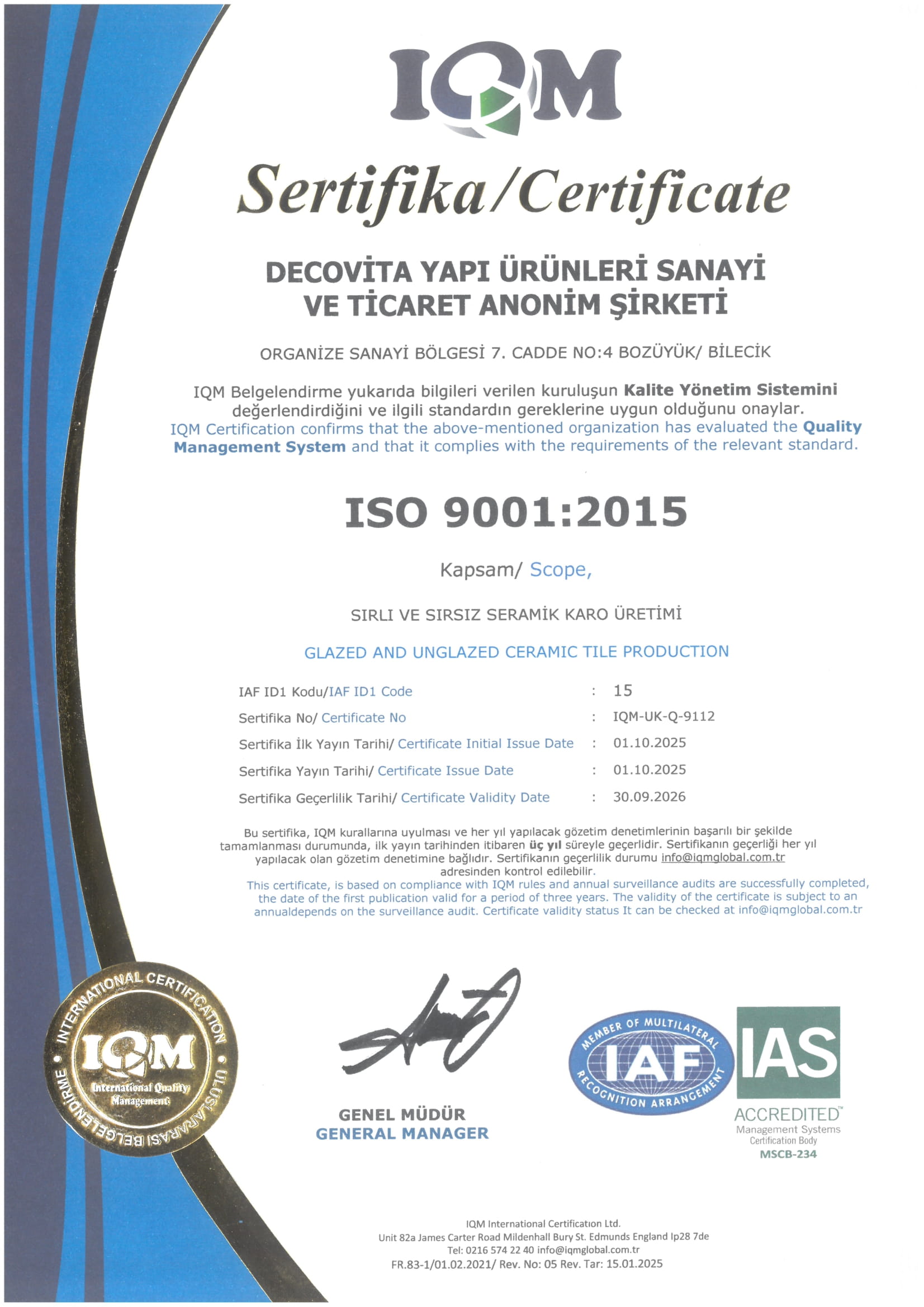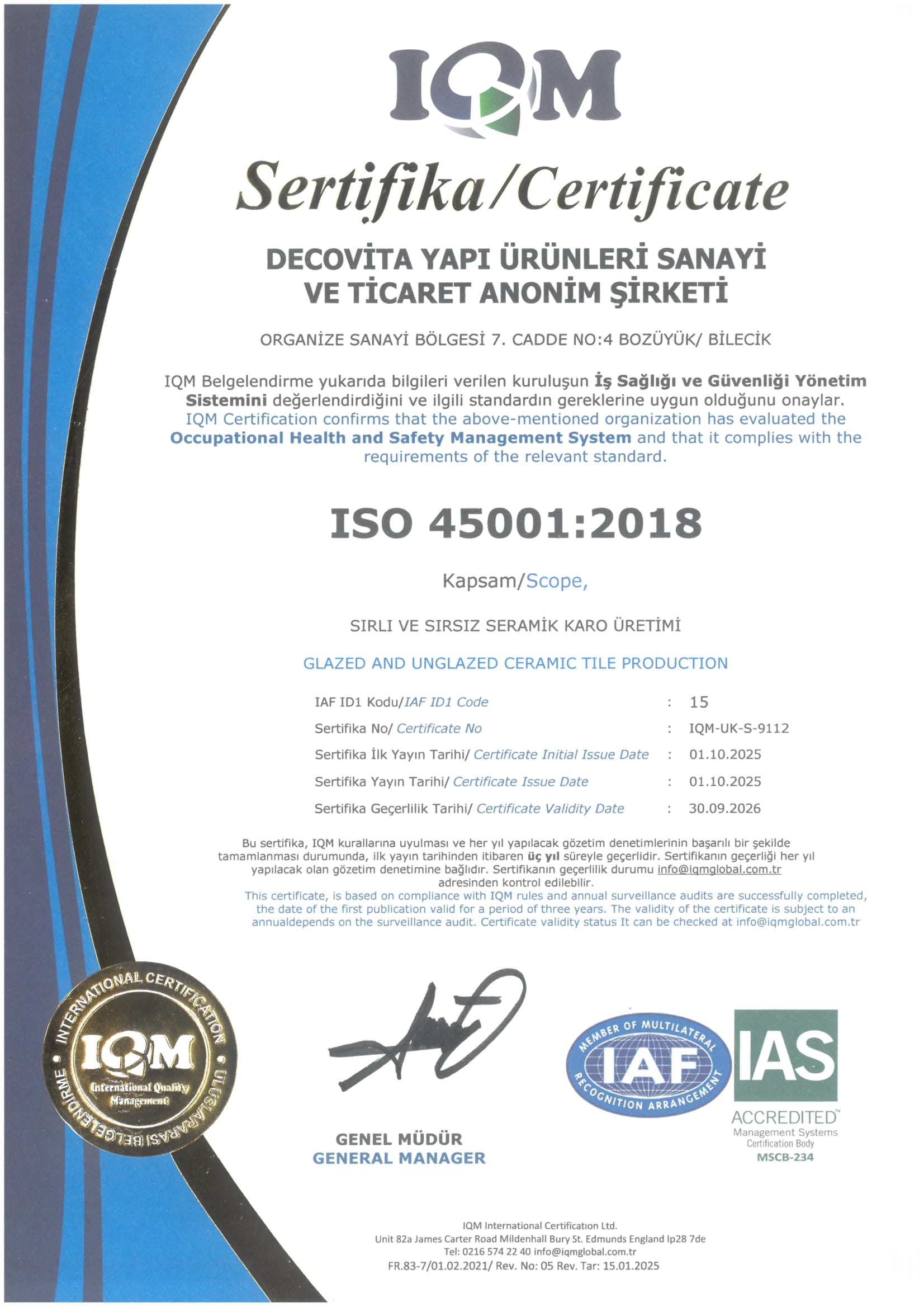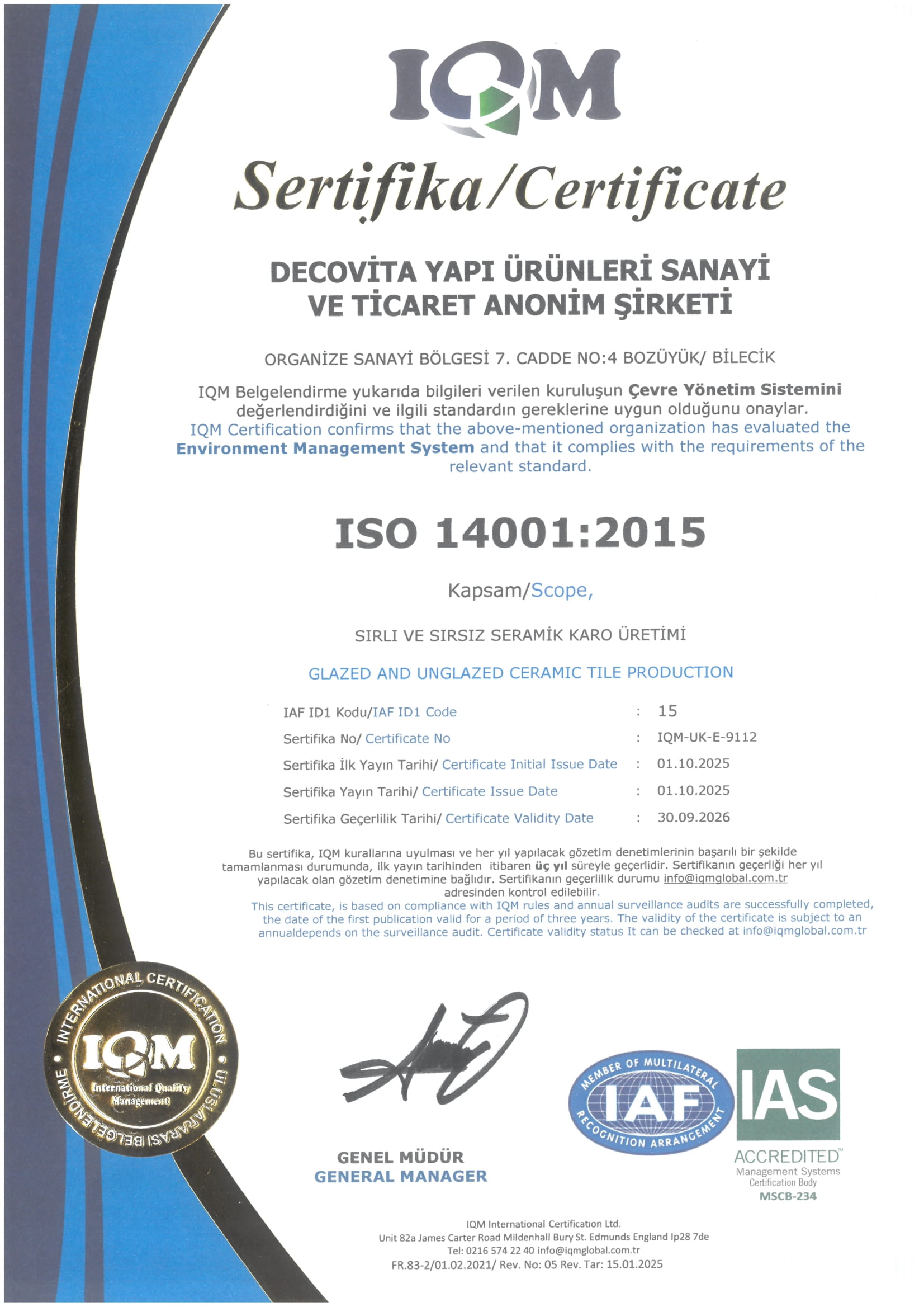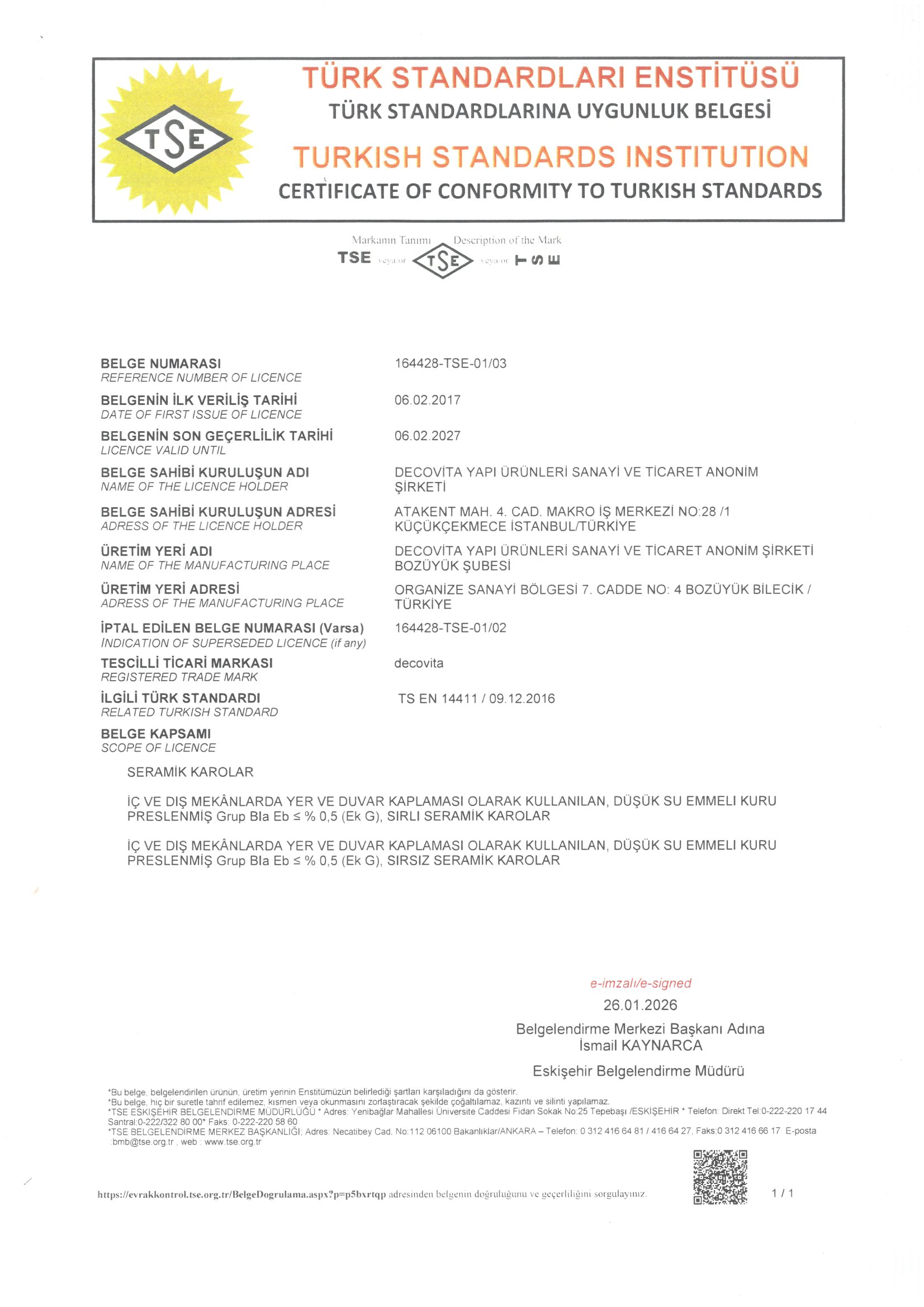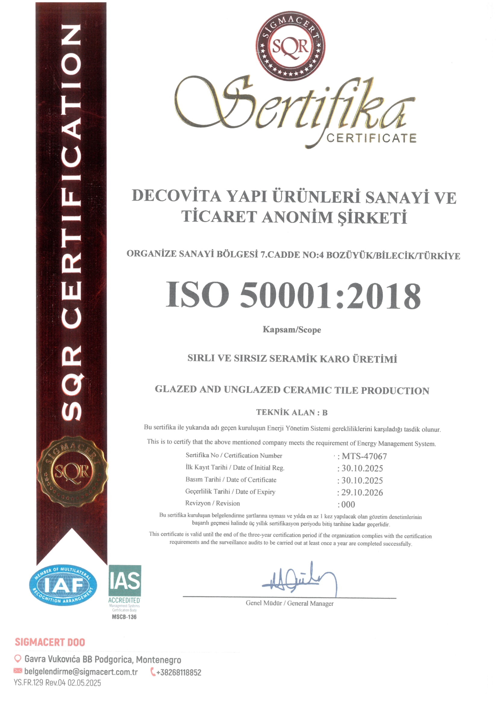 Decovita Yapı Ürünleri Sanayi ve Ticaret A.Ş. olarak ; ISO 9001:2015 Kalite Yönetim Sistemi, ISO 14001:2015 Çevre Yönetim Sistemi, ISO 45001:2018 İş Sağlığı ve Güvenliği Yönetim Sistemi, ISO 50001:2018 Enerji Yönetim Sistemi’ nden oluşan Entegre Yönetim Sistemlerini uygulayarak; sırlı rektifiyeli mat/parlak porselen karo tasarım, üretim ve satış faaliyetlerini gerçekleştirirken; daha iyi bir çevre, kaliteli üretim ve müşterilerimizin memnuniyetini ön planda tutan, güvenilir, yenilikçi, şeffaf ve duyarlı bir kuruluş olarak;